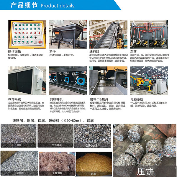 卧式铁屑打饼机为山东百兴智能的一款新型设备,适用于铁屑、破碎料、钢渣、铝渣等金属屑的压饼或压块成型,全套伺服数控系统,自动送出料装置,电子称可以实现每块压饼80公斤的重量,伺服系统节能省电、噪音低、体积小、速度快并可调,工业油冷机有效的控制油温,确保水泥正常运作。