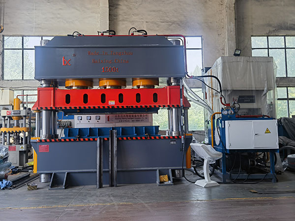 说明:本机为1500吨四柱液压机,为客户量身定制,用于长形U型槽折弯压弧、集装箱板成型,工作台加长设计,三缸设计使受力更均匀。